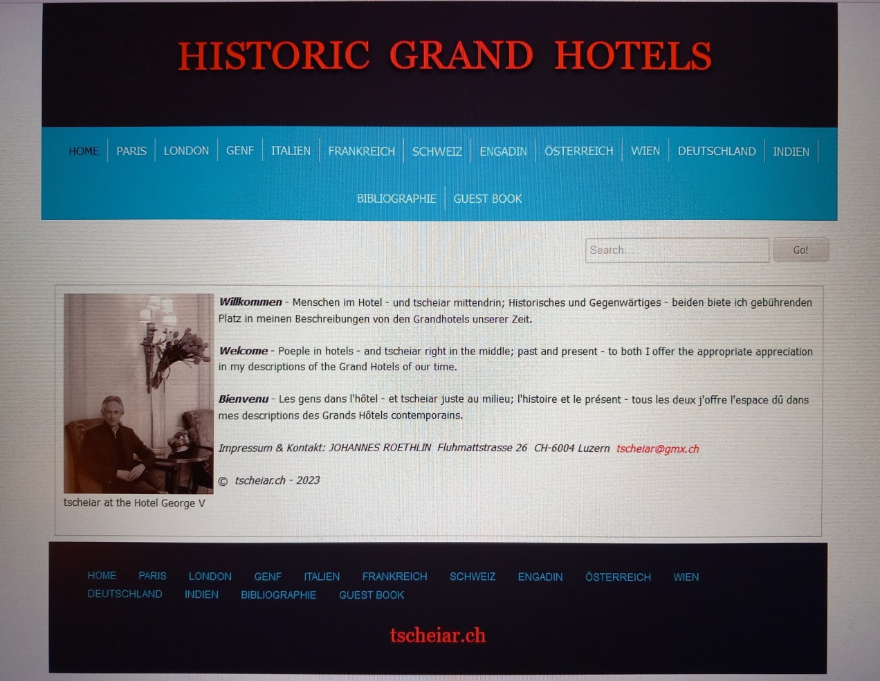 Von 2006 bis 2023 wurden Sie auf tscheiar.ch mit der Überschrift HISTORIC GRAND HOTELS empfangen. Falls Sie Fragen zu den Inhalten jener Zeit haben, können Sie mir gerne schreiben. Ich habe die alte Website gespeichert.